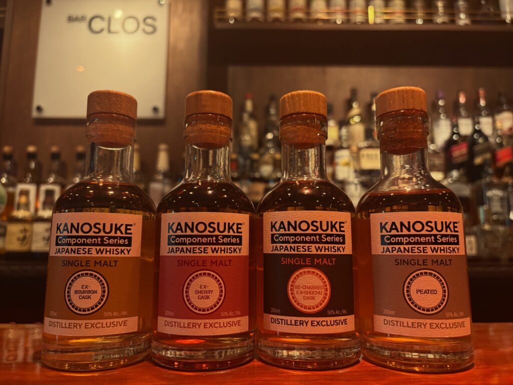 シングルモルト嘉ノ助の構成原酒であるComponent Series。写真左側からEXバーボンカスク、EXシェリーカスク、リチャードEX焼酎カスク、ピーテッドとなっています。
